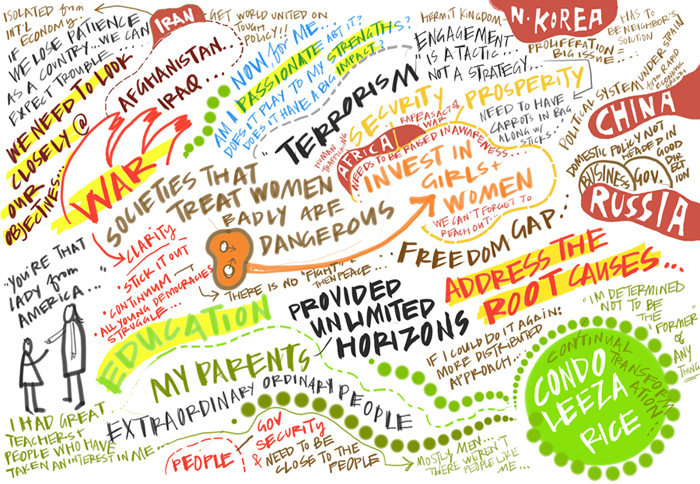 Typically, we interview and visually record conversations ranging from the global economy, terrorism, reforms in education, and world hunger. Depending on the need, scribes can document during a general session, or, in a follow up interview with the expert. Typically, the content scribes extract is dispersed digitally or may be published in book form. Above, Melinda Gates speaks with Fortune editor at large, Pattie Sellers as scribe Sita Magnuson notes the conversation.