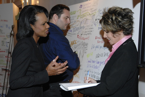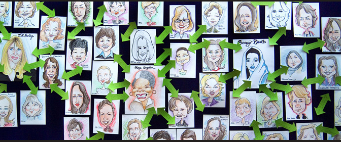 Event sponsor (multi-national professional services firm) Deloitte U.S chose eight women newsmakers and historical figures who changed the world in some way -- ie., Benazir Bhutto, JK Rowling, Katharine Graham, Maya Angelou. We asked the businesswomen to describe how they personally or professionally connected to one of the eight personalities. The women shared hundreds of anecdotes on the green arrows you see in the photo above, and linked them with their own portraits, sketched live by professional caricaturists.